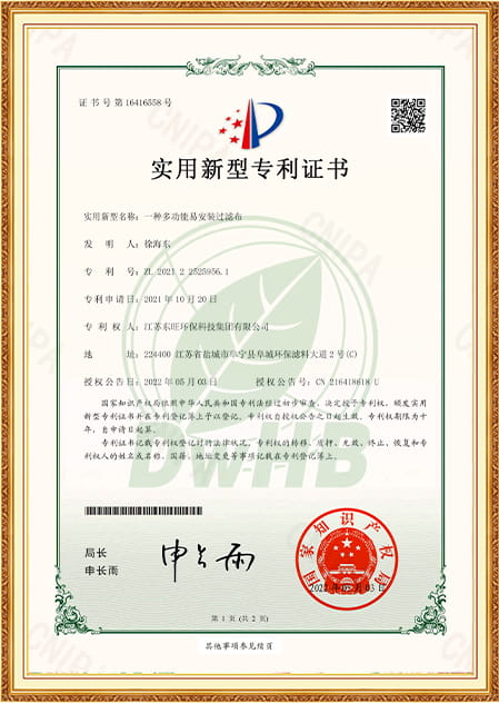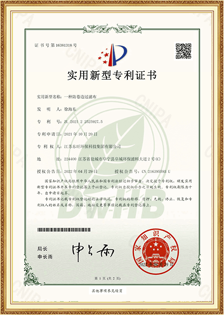 Vårt selskap har sterk økonomisk styrke, profesjonelt teknisk team, avansert produksjonsutstyr og god kvalitetssikring av testinstrumenter. Selskapet vedtatt ISO9001-2008 Kvalitetssystemsertifisering i bransjen, og oppnådde National Environmental Label Product Certification i 2015. Det ble godkjent som National High-Tech Enterprise i 2019, oppnådd sertifikatet til Yancheng Environmental Engineering Technology Researchs Center i 2021, Dongwang ble vurdert som et spesialisert og spesialbedrift. Det er en av de utpekte miljøvernfiltermaterialforetakene i Jiangsu -provinsen.